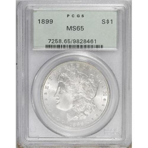 <B>1899 $1 MS65 PCGS.</B></I> PCGS Population (885/189). NGC Census: (516/69). Mintage: 330,846. Numismedia Wsl. Price for NGC/PCGS coin in MS65: $700. (#7258)<BR><BR><B>Coin Engraver:</B> George T. Morgan<BR><BR><b>Shipping:</b> Coins & Currency (<a target="_blank" href="http://www.heritageauctions.com/common/shipping.php">view shipping information</a>)
