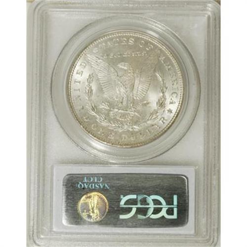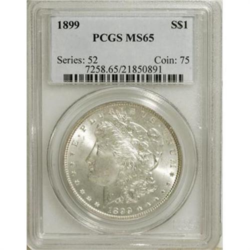 <B>1899 $1 MS65 PCGS.</B></I> Sharply struck motifs stand out on this Gem Morgan dollar. Silver-white surfaces offer vibrant luster and excellent preservation. With its mintage of under a third of a million pieces, the 1899 is a popular issue.<BR><I>From The Oxford Collection.</B></I><BR><BR><B>Coin Engraver:</B> George T. Morgan<BR><BR><b>Shipping:</b> Coins & Currency (<a target="_blank" href="http://www.heritageauctions.com/common/shipping.php">view shipping information</a>)