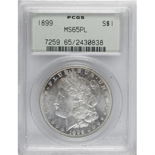 <B>1899 $1 MS65 Prooflike PCGS.</B></I> Golden-brown and apple-green freckles enrich the borders of this attractively preserved, satiny, and crisply struck Gem. A popular low mintage date. Certified in an old green label holder. Population: 68 in 65 Prooflike, 7 finer (5/07).<BR><BR><b>Shipping:</b> Coins & Currency (<a target="_blank" href="http://www.heritageauctions.com/common/shipping.php">view shipping information</a>)