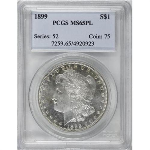 <B>1899 $1 MS65 Prooflike PCGS.</B></I> This 1899 Gem prooflike specimen displays hints of light gold and ice-blue color on bright surfaces. An attentive strike leaves sharp definition on the design features, including the hair at Liberty's ear and on the eagle's breast feathers. A few minuscule marks likely keep from an even finer grade. Population: 70 in 65 Prooflike, 7 finer (3/08).<BR><BR><B>Coin Engraver:</B> George T. Morgan<BR><BR><b>Shipping:</b> Coins & Currency (<a target="_blank" href="http://www.heritageauctions.com/common/shipping.php">view shipping information</a>)
