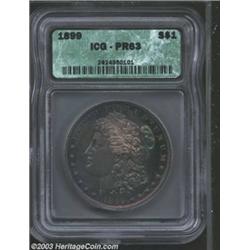 <TABLE cellSpacing=0 cellPadding=0 width="100%" bgColor=#000000 border=0><TBODY><TR><TD width="100%"><TABLE cellSpacing=1 cellPadding=3 width="100%" border=0><TBODY><TR><TD width="100%" bgColor=#79735c><FONT face=arial color=#ffffff size=3><B>Description</B> </FONT></TD></TR><TR><TD width="100%" bgColor=#ffffff><FONT face=arial size=2><B>1899 $1 PR63 ICG.</B></I> An exquisitely struck example with deep mauve patina that transforms into violet and cobalt-blue shades when rotated under a light. Only a few very faint slide marks on the cheek preclude a higher grade. A scant 846 pieces were struck. </FONT></TD></TR></TBODY></TABLE></TD></TR></TBODY></TABLE><BR><A name=PricesRealized></A><TABLE cellSpacing=0 cellPadding=0 width="100%" bgColor=#000000 border=0><TBODY><TR><TD width="100%"><TABLE cellSpacing=1 cellPadding=3 width="100%" border=0><TBODY><TR><TD width="100%" bgColor=#79735c><A name=PR><FONT face=arial color=#ffffff size=3><B>Previous Prices from Heritage Auctions</B> </FONT></A></TD></TR><TR><TD bgColor=#f6f6ed><TABLE cellSpacing=0 cellPadding=0 width="100%" border=1><TBODY><TR><TD align=middle width="33%"><B>Date</B></TD><TD align=middle width="33%"><B>Service</B></TD><TD align=middle width="33%"><B>Price</B></TD></TR><TR bgColor=whitesmoke><TD width="33%"><B>01/11/2003</B></TD><TD width="33%">PCGS</TD><TD width="33%">$1,725.00</TD></TR><TR bgColor=whitesmoke><TD width="33%"><B>01/05/2001</B></TD><TD width="33%">ANACS</TD><TD width="33%">$1,150.00</TD></TR><TR bgColor=whitesmoke><TD width="33%"><B>07/29/2003</B></TD><TD width="33%">NGC</TD><TD width="33%">$1,840.00</TD></TR></TBODY></TABLE></TD></TR><TR><TD bgColor=#ffffff><FONT face=arial size=1 ?>PLEASE NOTE: All prices realized reflect the final hammer price PLUS the buyer's premium in auctions that charge a buyer's premium. Each item has a notation at the top of the listing indicating whether that lot included a buyer's premium. Example: A item that sells with a final hammer price of $100 and a 20% buyer's premium will display with a price realized of $120. All information listed is intended to be as accurate as possible, but errors are possible. Please use this guide carefully and inform us of any inaccuracies. </FONT></TD></TR></TBODY></TABLE></TD></TR></TBODY></TABLE><BR><TABLE cellSpacing=0 cellPadding=0 width="100%" bgColor=#000000 border=0><TBODY><TR><TD width="100%"><TABLE cellSpacing=1 cellPadding=3 width="100%" border=0><TBODY><TR><TD width="100%" bgColor=#79735c colSpan=6><FONT face=arial color=#ffffff size=3><B>Price Guide*</B> </FONT></TD></TR><TR bgColor=#f6f6ed><TD align=middle><B>Grade</B> </TD><TD align=middle><B>Coin World<BR>(Trends)</B> </TD><TD align=middle><B>Numismedia<BR>Retail</B> </TD><TD align=middle><B>Numismedia<BR>Wholesale</B> </TD><TD align=middle><B>Coin<BR>Universe</B> </TD><TD align=middle><B>Heritage<BR>Value Index</B> </TD></TR><TR bgColor=#ffffff><TD align=middle>62</TD><TD align=right>---</TD><TD align=right>---</TD><TD align=right>$1,050.00</TD><TD align=right>$1,200.00</TD><TD align=right>$945.00</TD></TR><TR style="FONT-WEIGHT: bold" bgColor=#cccfdd><TD align=middle>63</TD><TD align=right>---</TD><TD align=right>---</TD><TD align=right>$1,725.00</TD><TD align=right>$2,150.00</TD><TD align=right>$1,473.33</TD></TR><TR bgColor=#ffffff><TD align=middle>64</TD><TD align=right>---</TD><TD align=right>---</TD><TD align=right>$2,550.00</TD><TD align=right>$3,450.00</TD><TD align=right>$2,334.00</TD></TR><TR bgColor=#ffffff><TD colSpan=6><FONT size=1>*All information listed is intended to be as accurate as possible, but errors are possible. No item may be returned or refused based on this information which is provided as a service to our customers. You should contact each pricing source directly to determine the accuracy of this information. </FONT></TD></TR></TBODY></TABLE></TD></TR></TBODY></TABLE><BR><TABLE cellSpacing=0 cellPadding=0 width="100%" bgColor=#000000 border=0><TBODY><TR><TD width="100%"><TABLE cellSpacing=1 cellPadding=3 width="100%" border=0><TBODY><TR><TD width="100%" bgColor=#79735c><FONT face=arial color=#ffffff size=3><B>Population Guide</B> </FONT></TD></TR><TR bgColor=#ffffff><TD align=middle><!-- Begin Output of Population Grid--><TABLE cellSpacing=0 cellPadding=0 width="100%" border=0><TBODY><TR><TD vAlign=center><TABLE cellSpacing=0 width="100%" border=1 cellsadding="3"><TBODY><TR><TD vAlign=center><TABLE cellSpacing=0 cellPadding=3 width="100%" border=1><TBODY><TR><TD vAlign=center align=middle bgColor=#f0f1e8 colSpan=2 <CENTER><FONT face=Arial size=2><B>PCGS Pop </B></FONT><CENTER></CENTER></TD><TD vAlign=center align=middle bgColor=#f0f1e8 colSpan=2><CENTER><FONT face=Arial size=2><B>NGC Pop</B></CENTER></FONT></TD></TR><TR><TD vAlign=center><FONT face=Arial size=2>(63)</FONT> </TD><TD vAlign=center align=right><FONT face=Arial size=2>49</FONT> </TD><TD vAlign=center><FONT face=Arial size=2>(63)</FONT> </TD><TD vAlign=center align=right><FONT face=Arial size=2>18</FONT> </TD></TR><TR><TD vAlign=center><FONT face=Arial size=2>(>63)</FONT> </TD><TD vAlign=center align=right><FONT face=Arial size=2>75</FONT> </TD><TD vAlign=center><FONT face=Arial size=2>(>63)</FONT> </TD><TD vAlign=center align=right><FONT face=Arial size=2>93</FONT> </TD></TR></TBODY></TABLE></TD></TR></TBODY></TABLE></TD></TR></TBODY></TABLE><!-- End Output of Population Grid--> Important notice: Heritage usually auctions material at the rate of 200-250 lots per hour. On some occasions eBay Live bid software or the Internet may not be able to keep up with the pace of the auction. We recommend placing a realistic absentee bid now as insurance to avoid disappointment. Occasionally the auctioneer may eliminate or reject an eBay Live bid, and the auctioneer may also reopen a lot after the close of the eBay live bidding (usually because we missed an audience bid), and may reject your bid even if it shows you as the winning bidder. By bidding via eBay Live, you agree that Heritage may award the lot to an