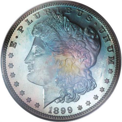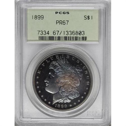 <B>1899 $1 PR67 PCGS.</B></I> Bright surfaces are covered in a low intensity veneer of sky-blue, lilac, and gold patination, rendering simply outstanding beauty. A well executed strike emboldens all of the design features, and close examination reveals immaculate preservation. Housed in a green-label holder. Population: 10 in 67, 0 finer (11/07).<BR><I>From The Chandler Collection.</B></I><BR><BR><B>Coin Engraver:</B> George T. Morgan<BR><BR><b>Shipping:</b> Coins & Currency (<a target="_blank" href="http://www.heritageauctions.com/common/shipping.php">view shipping information</a>)