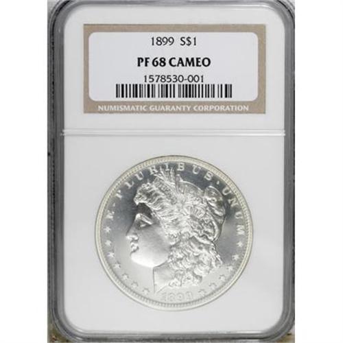 <B>1899 $1 PR68 Cameo NGC.</B></I> The 1899 proof dollars have a wider appeal than certain other dates, due to the scarcity of related business strikes. Today's collecting emphasis distinguishes proofs and business strikes as different collections, but older collectors did not make such a distinction, collecting proofs and business strikes interchangeably. A bold strike and fully brilliant untoned proof surfaces are immediately evident upon inspection of this amazing Cameo proof Morgan dollar. The contrast is moderate on the obverse and deeper on the reverse.<BR><BR><b>Shipping:</b> Coins & Currency (<a target="_blank" href="http://www.heritageauctions.com/common/shipping.php">view shipping information</a>)