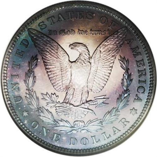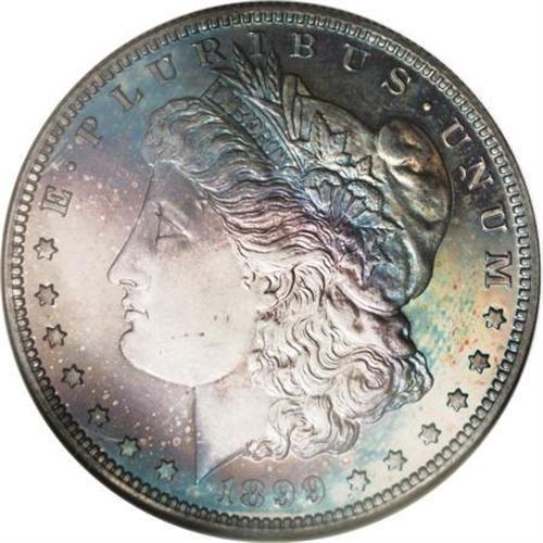<B>1899 $1 PR68 NGC.</B></I> A multi-color beauty with arcs of gold, blue-green, and mauve-rose on each side. The strike is just slightly shy of absolute on the hair above the ear, but the design details are otherwise exacting, with the eagle's breast feathers particularly impressive. This pristine specimen delivers an unmatchable combination of eye appeal and preservation. A scant 846 proofs were issued, a lower mintage than the famous 1895 dollar. The associated business strike mintage of 330,000 pieces is among the lowest from the Philadelphia Mint, although Uncirculated examples are much more available than proofs. Census: 4 in 68, 1 finer (8/07).<BR><BR><B>Coin Engraver:</B> George T. Morgan<BR><BR><b>Shipping:</b> Coins & Currency (<a target="_blank" href="http://www.heritageauctions.com/common/shipping.php">view shipping information</a>)
