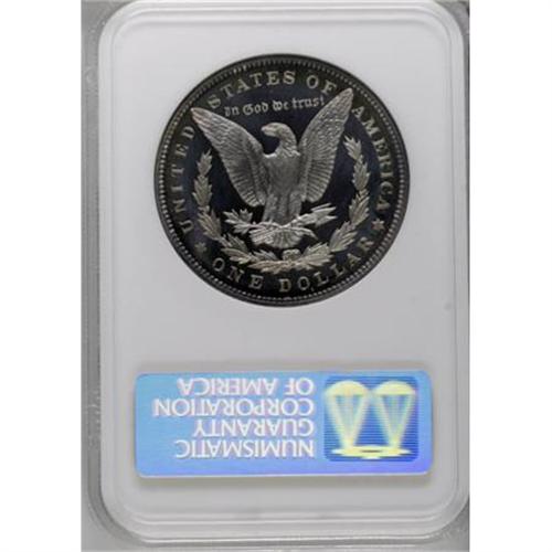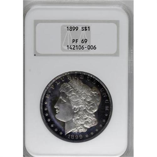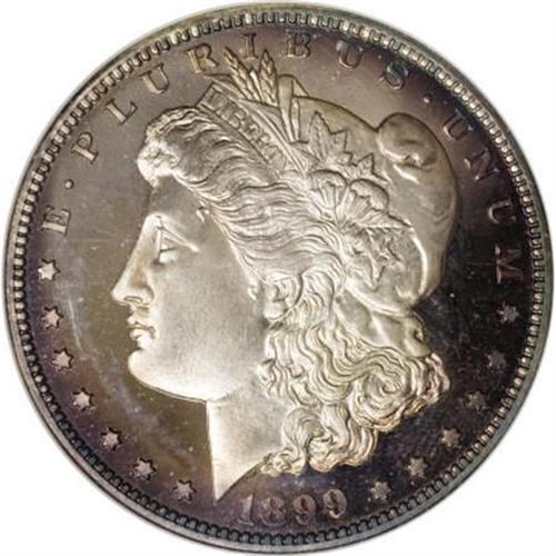 <B>1899 $1 PR69 NGC.</B></I> A numerical grade of 69, Mint State or proof, assigned to any coin is a statement that the coin is perfect. The higher grade of 70 does not exist, except for certain modern issue pieces. Only 18 proof Morgan dollars are graded so high by NGC and PCGS. The Cameo, Ultra Cameo, and <B> S</B></I> designations are assigned to some, but all 18 grading events represent perfection in the Morgan series.<BR> What does it take to grade PR69? John Dannreuther explains the standards in <I>The Official Guide to Coin Grading and Counterfeit Detection</B></I>. While published by PCGS, these standards should apply equally to each independent grading service.<BR> “<B>MARKS:</B></I> This coin will appear perfect to the unaided eye. Upon magnification, one or two minute imperfections (extremely minor hairlines, a previously hidden lint mark, a flake from the planchet, etc.) will be evident. Note: Slight die polish, very minor die breaks, or incomplete striking will <I>not</B></I> preclude a coin from attaining this grade.<BR> “<B>STRIKE:</B></I> The strike will be full, showing all of the detail intended.<BR> “<B>LUSTER:</B></I> The surfaces must be fully reflective (if applicable) and not negatively affected by toning or patina. Any toning must be attractive.<BR> “<B>EYE APPEAL:</B></I> Superb! Note: Darkly toned proof coins will <I>not</B></I> grade Proof-69.”<BR><BR> Having an understanding of the various elements necessary for the grade, application of these standards will show the desirability of this amazing dollar.<BR> A cursory unmagnified examination of this piece does not reveal any marks on either side. Further critical examination with a 5x magnifier reveals only the few tiny planchet flakes and minor hairlines that prevent all coins from the magical grade of 70. As the coin resides in a holder, it is necessary to distinguish between actual hairlines on the coin surface and those on the holder that are reflected by the deep mirrors. Die polish is limited to the open area of Liberty’s cheek.<BR> The element of strike in the grading standards seems a little unclear. A full strike is required, with a note that an incomplete strike will not preclude the grade. While two or three intricate hair strands over the ear are slightly merged, the strike can be considered full for purposes of assigning the grade.<BR> Deep mirrors are completely reflective with a crisp transition to the lettering and devices. Central obverse and reverse motifs exhibit full silver color with the obvious cameo contrast that creates superb eye appeal. The obverse is brilliant and white at the centers with incredible violet and blue toning around the border. The reverse is similar with peripheral lilac and gold.<BR> Every aspect of this incredible proof Morgan meets the grading criteria. While not designated as such, it is also an impressive Cameo proof with full contrast between the fields and devices. Dave Bowers writes in <I>A Guide Book of Morgan Silver Dollars</B></I> that “there is no universally accepted definition of cameo in the trade, and opinions vary, as do labels affixed to holders.” In the case of this piece, the label should have been affixed to the holder. It is the single finest proof 1899 Morgan dollar graded by NGC or PCGS, and one of the top 18 examples of any date in the series.<BR><BR><B>Coin Engraver:</B> George T. Morgan<BR><BR><b>Shipping:</b> Coins & Currency (<a target="_blank" href="http://www.heritageauctions.com/common/shipping.php">view shipping information</a>\)