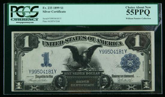 1899, $1 Silver Certificate. Choice About New 55PPQ. . Fr-233. A very lightly circulated Black Eagle $1, this note still displays tremendous originality and excellent eye appeal.