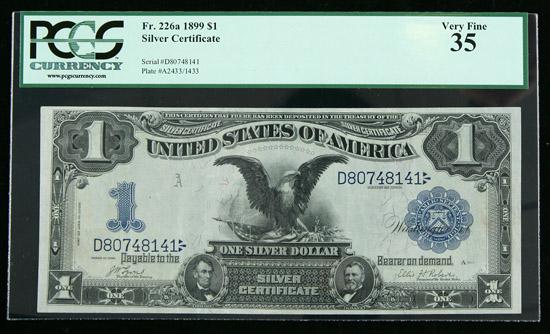 1899, $1 Silver Certificate. PCGS Very Fine 35. . Fr-226a. A pretty Black Eagle with some light hidden folds.