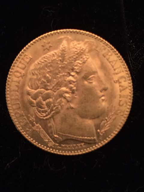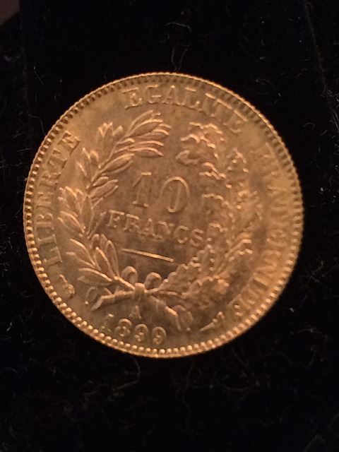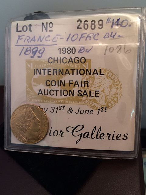 1899 10 Franc Gold Coin in brilliant uncirculated condition. In holder, bought 1980 Chicago International Coin Fair Auction Sale.