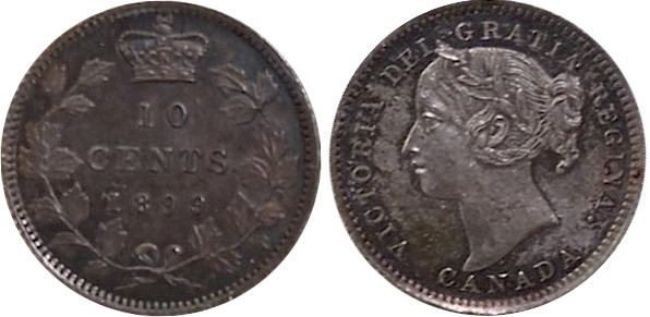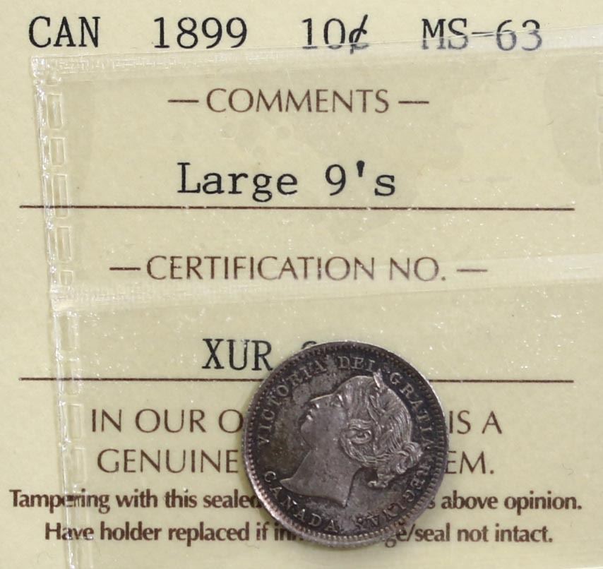 1899 10¢ "Large 9's" ICCS Choice Mint State-63. A superior example of this sought after variety.