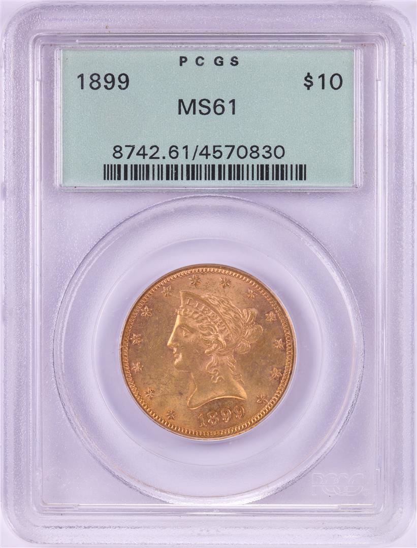 One 1899 $10 Liberty Head Eagle Gold Coin PCGS MS61 Old Green Holder. PCGS Graded.