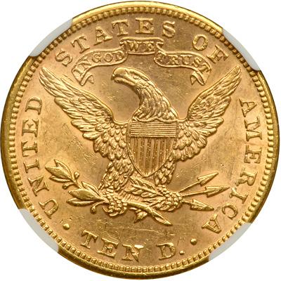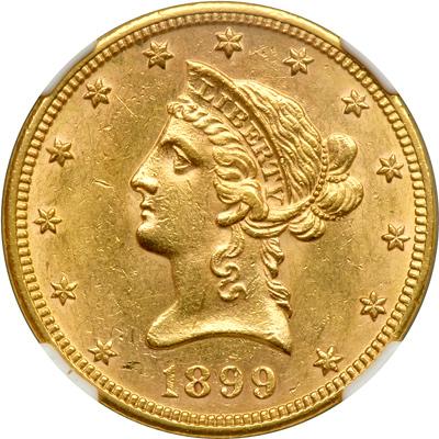 1899 $10 Liberty. NGC graded MS-61. The luster shimmers as the coin is dipped and turned under a lamp (PCGS # 8742) .