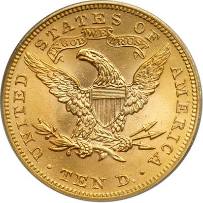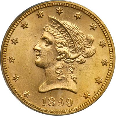 1899 $10 Liberty. PCGS graded MS-64. Well struck. Intense but still rich satiny frost, the coin lightly toned to a soft golden color through which brighter gold radiance persists almost undiminished. A dampened impression is sometimes (not often) found on 1899-P Eagles from the less than robust pressure of the dies that made this year's coinage; however, rather than being halfhearted, this particular coin's design is boldly crisp. A jewel of a coin! Pop 271; 27 finer, 23 in 65, 4 in 66 (PCGS # 8742) .