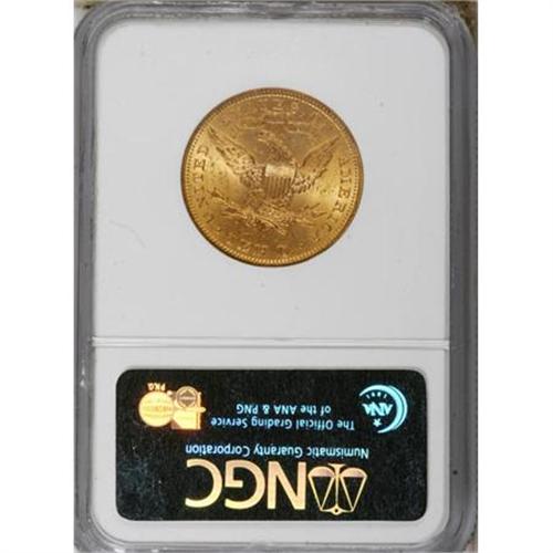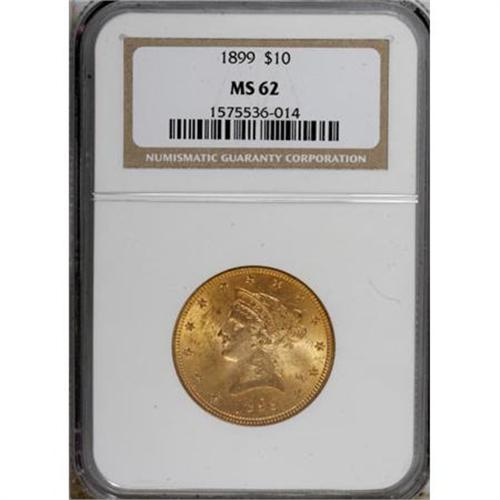 <B>1899 $10 MS62 NGC.</B></I> NGC Census: (5428/5171). PCGS Population (3648/1762). Mintage: 1,262,305. Numismedia Wsl. Price for NGC/PCGS coin in MS62: $395. (#8742)<BR><BR><B>Coin Engraver:</B> Christian Gobrecht<BR><BR><b>Shipping:</b> Coins & Currency (<a target="_blank" href="http://www.heritageauctions.com/common/shipping.php">view shipping information</a>\)