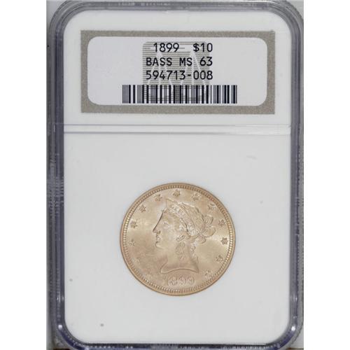 1899 $10 MS63 NGC. Ex: Bass. The well struck yellow-go