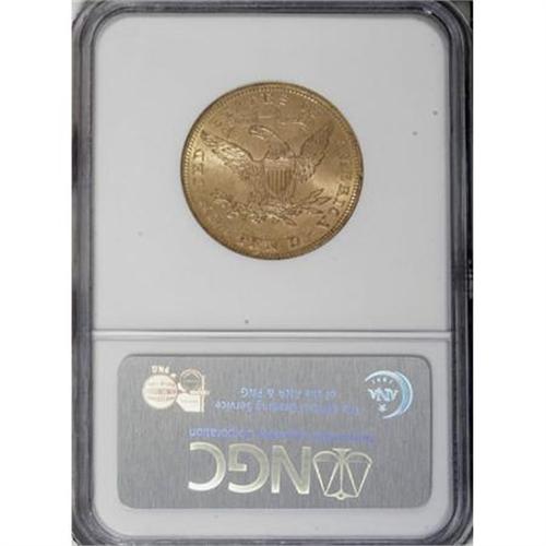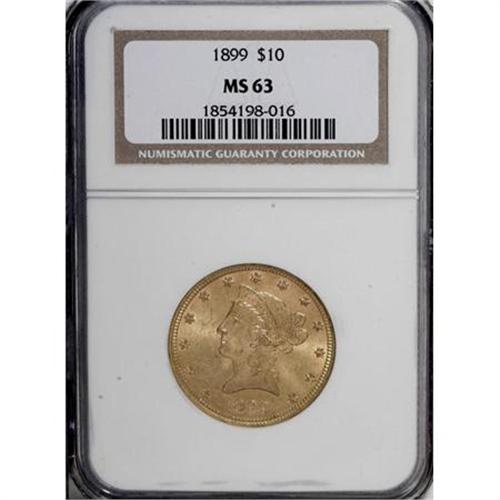 <B>1899 $10 MS63 NGC.</B></I> A powerful strike emboldens the design elements on this Select ten dollar, and glowing luster radiates from honey-gold surfaces. Minute, inoffensive contact marks limit the grade. An excellent type coin.<BR><BR><b>Shipping:</b> Coins & Currency (<a target="_blank" href="http://www.heritageauctions.com/common/shipping.php">view shipping information</a>)