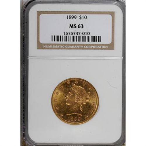 <B>1899 $10 MS63 NGC.</B></I> NGC Census: (4033/1171). PCGS Population (1503/267). Mintage: 1,262,305. Numismedia Wsl. Price for NGC/PCGS coin in MS63: $820. (#8742)<BR><BR><B>Coin Engraver:</B> Christian Gobrecht<BR><BR><b>Shipping:</b> Coins & Currency (<a target="_blank" href="http://www.heritageauctions.com/common/shipping.php">view shipping information</a>)