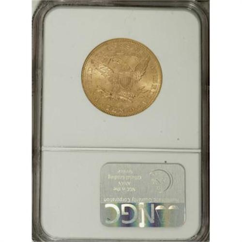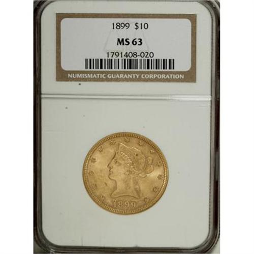 <B>1899 $10 MS63 NGC.</B></I> NGC Census: (4173/1204). PCGS Population (1573/277). Mintage: 1,262,305. Numismedia Wsl. Price for NGC/PCGS coin in MS63: $1,190. (#8742)<BR><BR><B>Coin Engraver:</B> Christian Gobrecht<BR><BR><b>Shipping:</b> Coins & Currency (<a target="_blank" href="http://www.heritageauctions.com/common/shipping.php">view shipping information</a>)