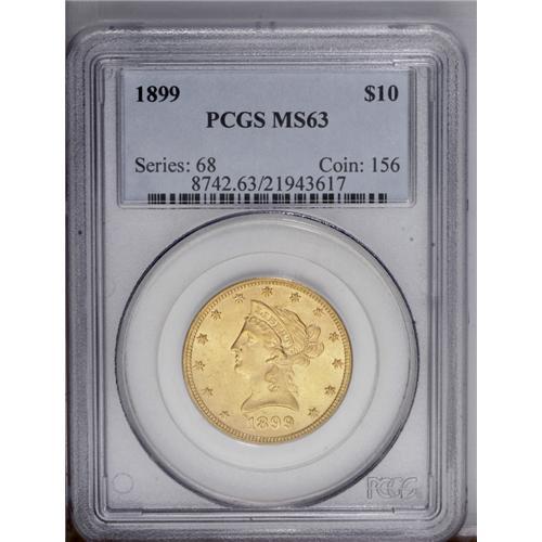 <B>1899 $10 MS63 PCGS.</B></I> Dazzling luster with blushes of golden-orange color ensure the eye appeal of this minimally abraded example. The design element are well struck throughout.