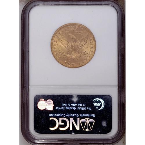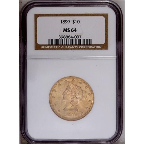 <B>1899 $10 MS64 NGC.</B></I> Original olive and apricot toning intermingles across this satiny and carefully preserved type coin. The strike is penetrating. A curious die scratch, as made, is seen atop the fifth vertical shield stripe.