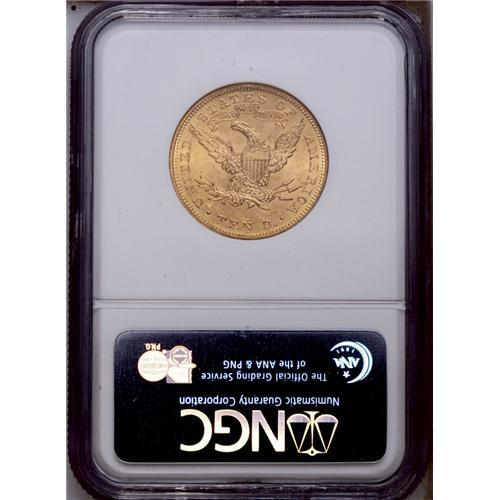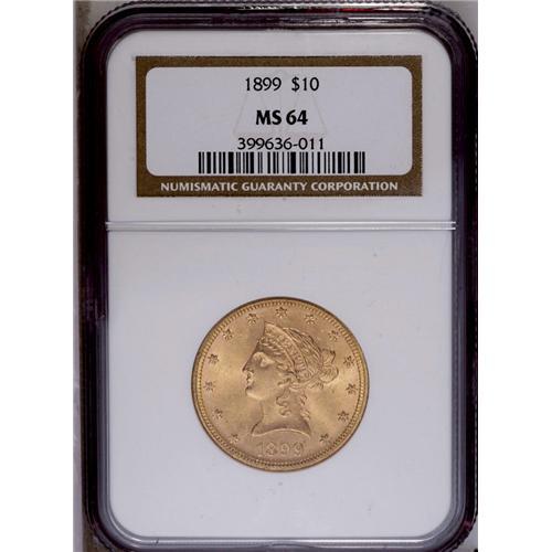 <B>1899<$10> MS64 NGC.</B></I> This khaki-gold Liberty ten has good luster, a bold strike, and no offensive marks. This turn of the century issue is scarce above the MS64 level.