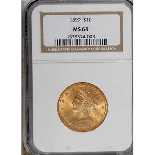 <B>1899 $10 MS64 NGC.</B></I> A canary-gold type coin that possesses a precise strike and vibrant cartwheel sweep. Faint luster grazes are largely confined to the obverse.<BR><BR><b>Shipping:</b> Coins & Currency (<a target="_blank" href="http://www.heritageauctions.com/common/shipping.php">view shipping information</a>)