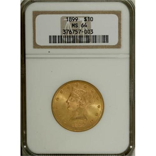 <B>1899 $10 MS64 NGC.</B></I> Lustrous yellow-gold surfaces are imbued with traces of light green and tan, and reveal just a few minor obverse marks. Sharply struck throughout.<BR><I>From The Southwest Collection.</B></I><BR><BR><B>Coin Engraver:</B> Christian Gobrecht<BR><BR><b>Shipping:</b> Coins & Currency (<a target="_blank" href="http://www.heritageauctions.com/common/shipping.php">view shipping information</a>)