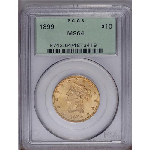 <B>1899 $10 MS64 PCGS.</B></I> An intricately struck and fully lustrous turn-of-the-century type coin. The light peach surfaces are relatively smooth. The 9's in the date are lightly repunched. Certified in a green label holder.