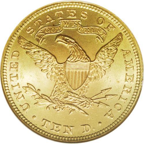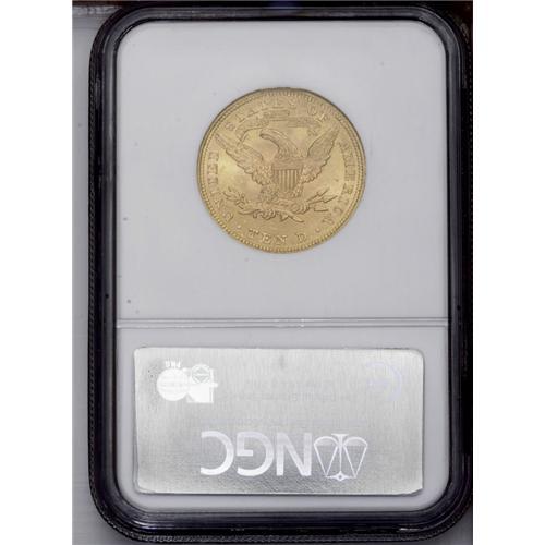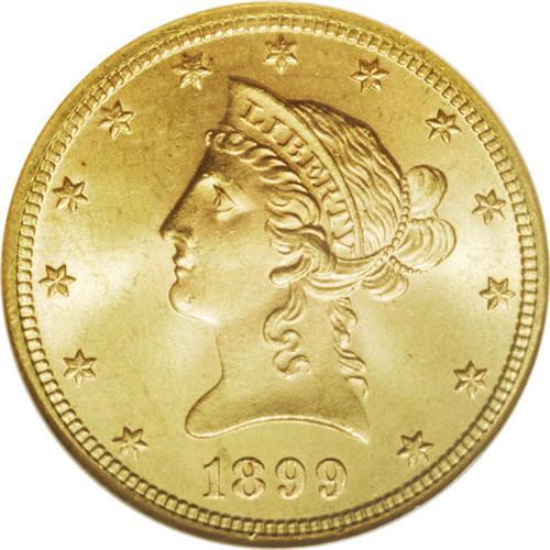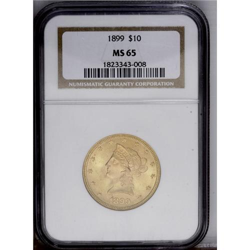 <B>1899 $10 MS65 NGC.</B></I> One of the few dates that can actually obtainable in Gem grades, the present coin shows strong luster and excellent eye appeal. Struck in greenish yellow-gold and the surfaces are a delight to behold. Identifiable by a minor nick on Liberty's chin. Census: 148 in 65, 19 finer (1/06).