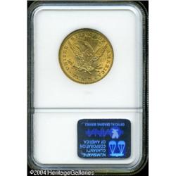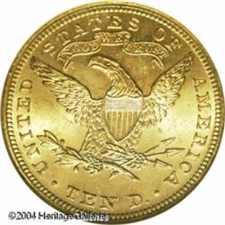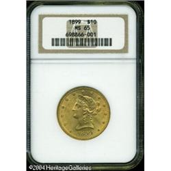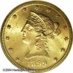 1899 $10 MS65 NGC. While the striking details are <B>1899 $10 MS65 NGC.</B></I> While the striking details are sharply struck throughout and there are no objectionable (or noticeable) marks on either side, what really sets this coin apart is the subtle, lightly variegated colored mint frost. Completely original and untampered, this is a splendid example of this popular 19th century issue. <BR><BR><B>Important notice:</B> Heritage usually auctions material at the rate of 200-250 lots per hour. On some occasions eBay Live bid software or the Internet may not be able to keep up with the pace of the auction. We recommend placing a realistic absentee bid now as insurance to avoid disappointment. Occasionally the auctioneer may eliminate or reject an eBay Live bid, and the auctioneer may also reopen a lot after the close of the eBay live bidding (usually because we missed an audience bid), and may reject your bid even if it shows you as the winning bidder. By bidding via eBay Live, you agree that Heritage may award the lot to another bidder at its sole discretion under the circumstances described above or any other reasonable circumstances. Since eBay bids are not shown to us until we open the lot on the floor, we treat those bids just like floor bids. In most cases the floor responds before the eBay bid is presented to us, due to Internet lag time, so for consistency we have made it a policy that floor bids are always considered first over tie eBay live bids. Also please note that all Heritage lots purchased through eBay Live carry a 20% Buyer's Premium. Please make sure you read the Terms and Conditions before you bid. This lot is being auctioned in conjunction with a live floor auction by Heritage Galleries & Auctioneers. All final auction and invoice information will be supplied by Heritage Galleries & Auctioneers, and all other information should be considered preliminary. Lot:6781