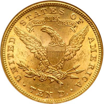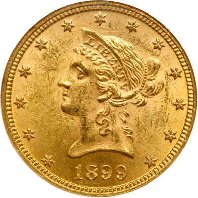 1899 $10. NGC graded MS-62. Subtle golden hues here and there on both sides.