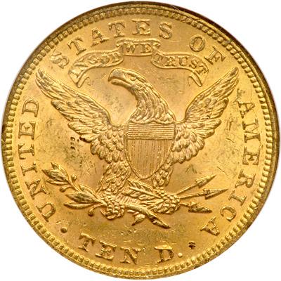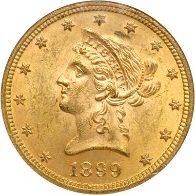 1899 $10. NGC graded MS-63. The obverse and reverse exhibit golden orange hues. We note a moderate contact mark on the obverse around 1:00.