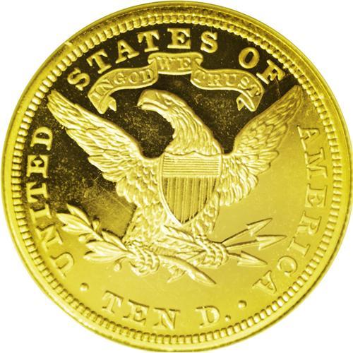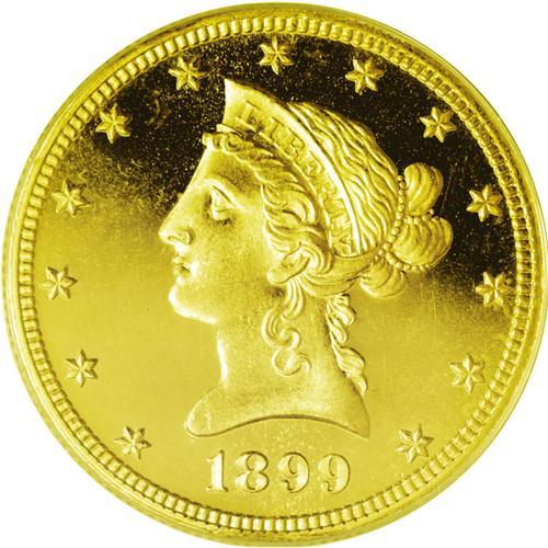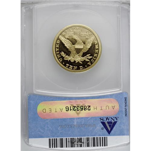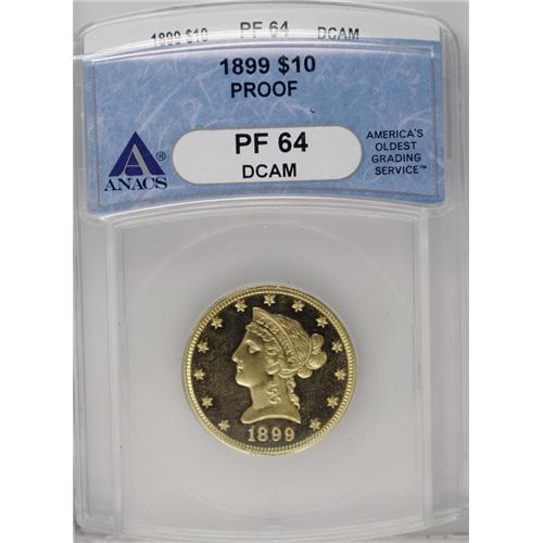 <B>1899<$10> PR64 Deep Cameo ANACS.</B></I> Proof gold is renowned as the <I>crme de la crme</B></I> of American numismatics: at once eminently approachable, yet sometimes unobtainable. Writing in 1989, Walter Breen, in his <I>Encyclopedia of United States and Colonial Proof Coins 1722-1989,</B></I> states that the 1899 proof eagle is "much rarer than commonly believed; seldom shows up." Indeed, a search through our auction archives reveals that we have offered this issue for sale only six times in the last dozen or so years, and that less than two dozen total examples have been offered for sale since 1976, for an <I>average of less than one auction appearance per year.</B></I> And, of course, Deep Cameo pieces such as the present example are exponentially rarer still. NGC and PCGS together report only a single piece graded in PR64 Deep Cameo, with eight graded finer (5/06). As another point of reference, the legendary Harry W. Bass, Jr. collection had a PR62 Cameo example of this issue.<BR> As per the Breen volume, this specimen--for a "specimen" it most assuredly is--shows the diagnostic recutting on the base of the 1 and the "microscopic" recutting on the base of the 8. Breen states that only 86 specimens were produced, with an estimated survival of 25 to 30 pieces today. The piece shows marvelous "black-on-gold" contrast provided by the deeply mirrored fields against near-pristine devices. Only the most trivial evidence of contact is in evidence: a minuscule luster graze on the chin, invisible without a loupe, and some tiny marks below the eagle, also unnoticeable except under magnification. Save for these minutiae, this spectacular piece would almost certainly rate a Gem grade. Proof gold specialists would do well to heed the sound of opportunity knocking here. <BR><BR><B>Important