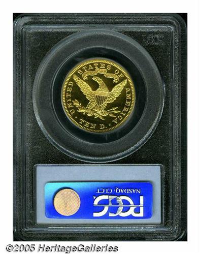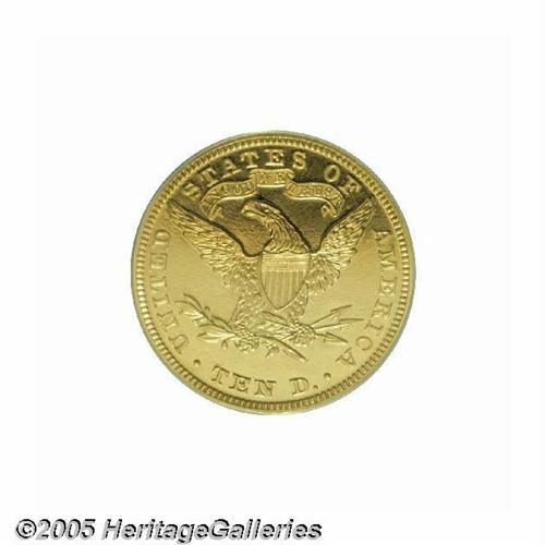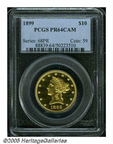 <B>1899<$10> PR64 Cameo PCGS.</B></I> The Philadelphia Mint delivered only 86 proof Liberty Eagles in 1899, fewer than 30 of which are believed extant. Writing in 1977, Breen opines that the 1899 is "much rarer than commonly believed..." Nicely cameoed, the surfaces are yellow-gold in color with modest olive accents that appear as the coin rotates beneath a light. We can find no singularly mentionable distractions, but a small curly lintmark is visible on Liberty's lower jaw should serve as a useful pedigree marker. A bright and flashy specimen, we recommend this coin for inclusion in either an advanced gold collection or a proof type set. Population: 2 in 64 Cameo, 0 finer (6/05).
