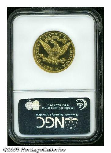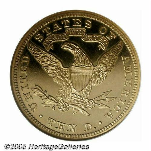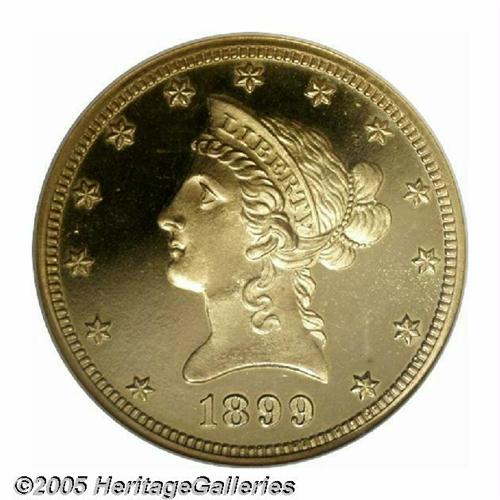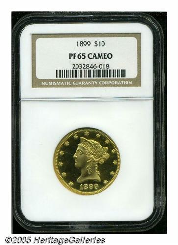 <B>1899<$10> PR65 Cameo NGC.</B></I> Much like the Trompeter specimen which we sold more than six years ago, this glittering proof Eagle is notable for the stark contrast between the glassy fields and the chalky, well frosted devices. A mere 86 pieces are reported to have been produced for collectors in the waning months of the 19th century, of which it is estimated that up to 40 percent failed to survive either outright or as recognizable proofs. The devices exhibit a slight halo effect that spills over into the mirrored fields. Future attribution can be facilitated by a tiny vertical planchet flaw to the left of the portrait's base. Population: 9 in 65 Cameo, 5 finer (5/05).<BR><I>From the Dr. Kurt Peters Collection.</B></I> From the Dr. Kurt Peters Collection.