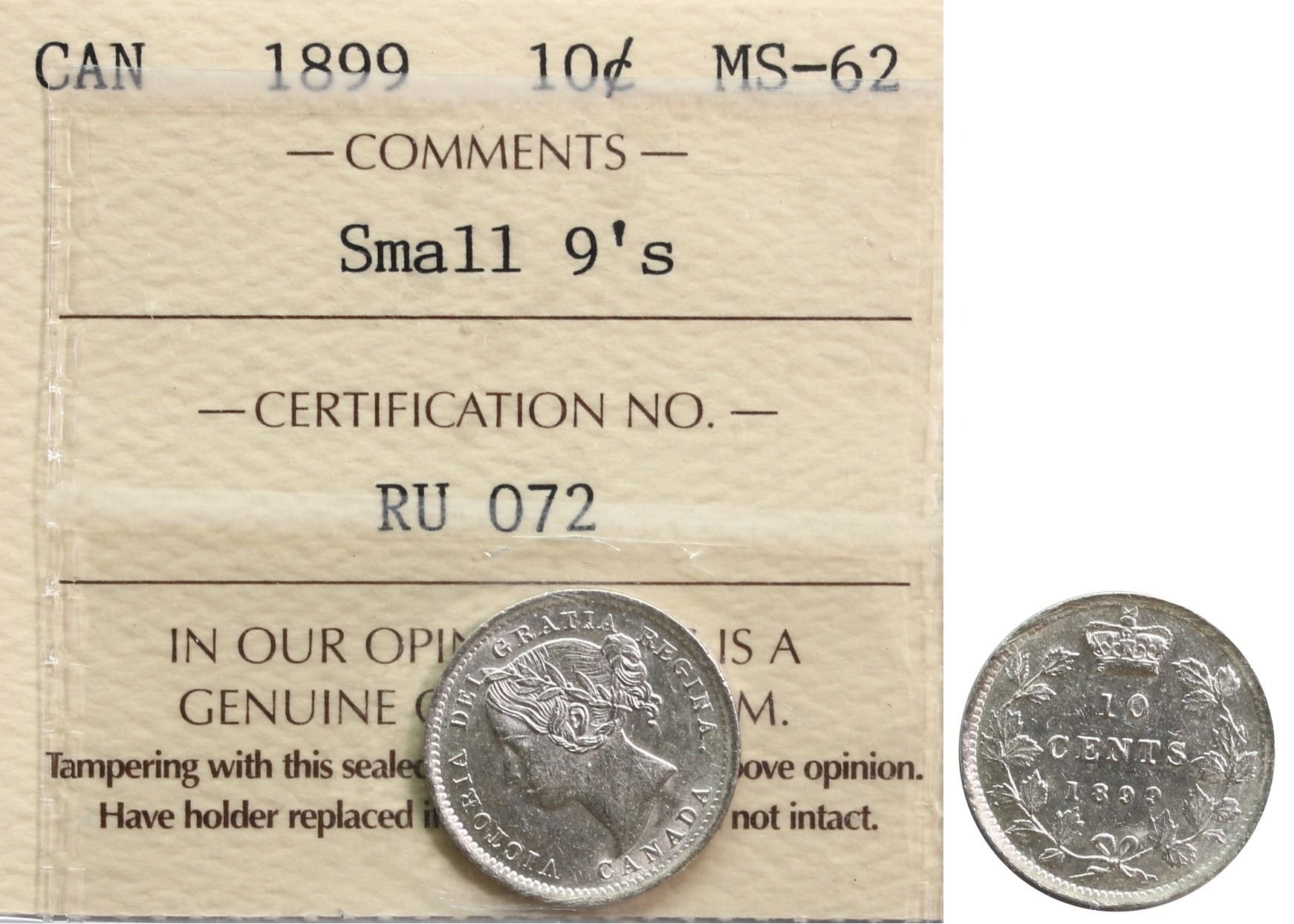 1899 10¢ "Small 9's" ICCS Choice Mint State-62 Brilliant and lustrous.
