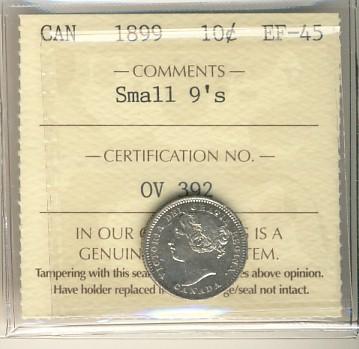 1899 10¢ Sml 9's ICCS EF45. Sharp strike and lustrous.