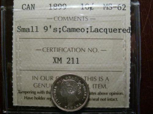 1899 10¢ Sml 9's ICCS MS62 CAMEO Super eye appeal and mirror-like finish. Lightly lacquered to protect the coin.