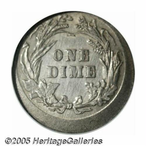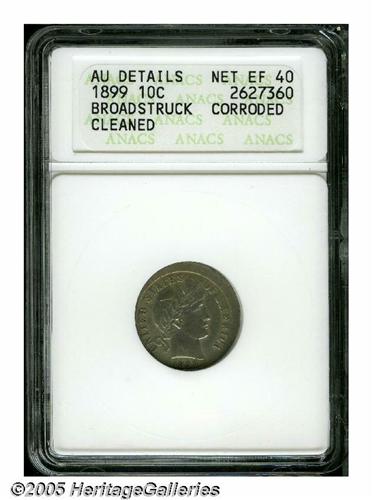 <B>1899<10C> Barber Dime--Broadstruck--Cleaned, Corroded--ANACS. AU Details, Net XF40.</B></I> An uncentered broadstrike with a moderate area of unstruck metal at its peak between 1 and 2 o'clock.<BR><I>From The Larry Rausch Collection, Part Five.</B></I>