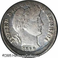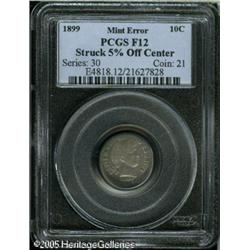 <B>1899 10C Barber Dime--Struck 5% Off Center--Fine 12 PCGS.</B></I> Intermingled dark steel and pale blue toning with indications of lighter silvery-gray color.<BR><I>From The Larry Rausch Collection, Part Three.</B></I> Lot:10972