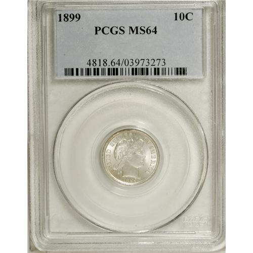 <B>1899 10C MS64 PCGS.</B></I> PCGS Population (75/36). NGC Census: (82/49). Mintage: 19,580,846. Numismedia Wsl. Price: $252. (#4818)<BR><BR><b>Shipping:</b> Coins & Currency (<a target="_blank" href="http://www.heritageauctions.com/common/shipping.php">view shipping information</a>)