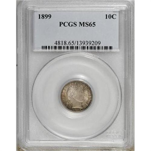<B>1899 10C MS65 PCGS.</B></I> PCGS Population (21/15). NGC Census: (41/8). Mintage: 19,580,846. Numismedia Wsl. Price for NGC/PCGS coin in MS65: $575. (#4818)<BR><BR><B>Coin Engraver:</B> Charles E. Barber<BR><BR><b>Shipping:</b> Coins & Currency (<a target="_blank" href="http://www.heritageauctions.com/common/shipping.php">view shipping information</a>)