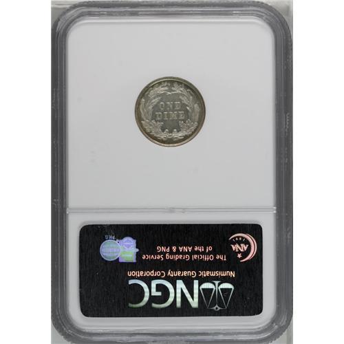 <B>1899<10C> MS65 Prooflike NGC.</B></I> Light pearl-gray toning is enriches by peripheral russet tints. An intricately struck and nearly unmarked Gem with uncommon field reflectivity for a business strike Barber dime. NGC has certified (as of 3/06) two pieces as Prooflike, both at the MS65 level.