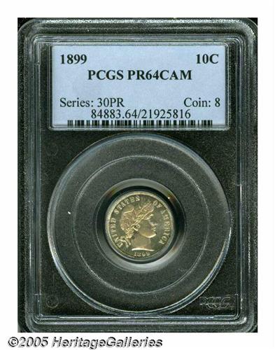 <B>1899<10C> PR64 Cameo PCGS.</B></I> Luminous surfaces are bathed in very light golden-tan patina, and a toning spot is apparent on the back of Liberty's neck. The design elements are exquisitely struck, and are noticeably contrasted against the mirrored fields. A couple of miniscule marks occur on Liberty's cheek. Population: 7 in 64, 13 finer (4/05).