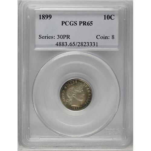 <B>1899<10C> PR65 PCGS.</B></I> The light coating of golden-orange deepens at the rims to steel-blue on this attractive Gem proof. Few distractions are visible, save for a stray lintmark on the reverse outside of the upper right wreath. Population: 32 in 65, 43 finer (6/06).