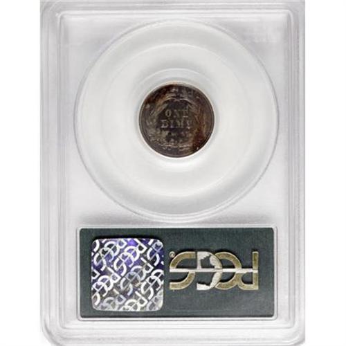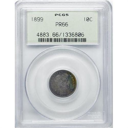 <B>1899 10C PR66 PCGS.</B></I> Forest-green patina dominates, although glimpses of peach and maroon cling to the borders. A meticulously struck and pleasing Premium Gem. Encased in an old green label holder. Only 846 proofs were issued. Population: 33 in 66, 14 finer (10/07).<BR><I>From The Chandler Collection.</B></I><BR><BR><B>Coin Engraver:</B> Charles E. Barber<BR><BR><b>Shipping:</b> Coins & Currency (<a target="_blank" href="http://www.heritageauctions.com/common/shipping.php">view shipping information</a>)