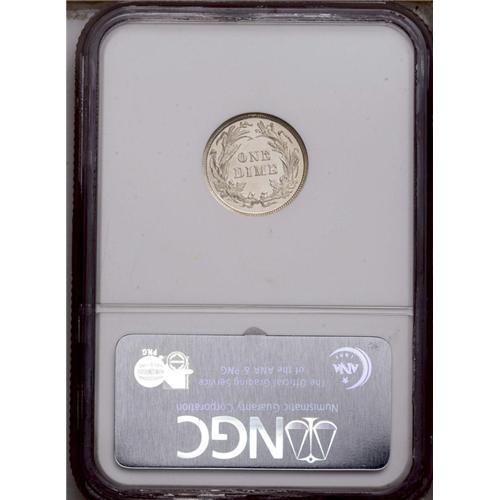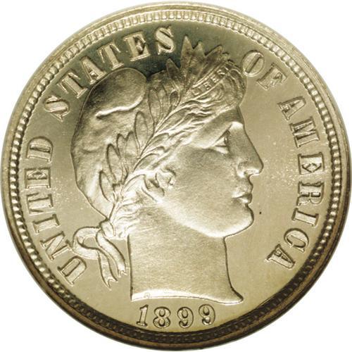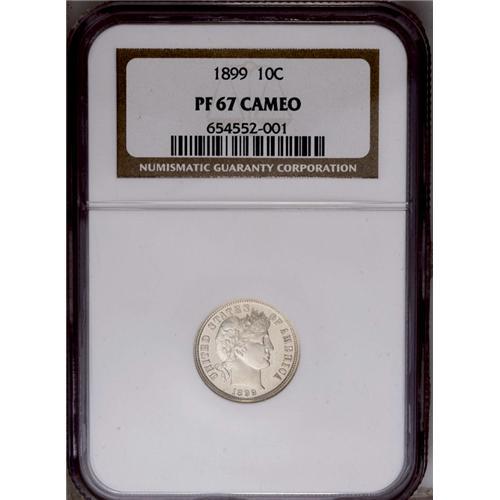 <B>1899<10C> PR67 Cameo NGC.</B></I> Only 846 proofs were coined for collectors in 1899, and this specimen represents one of the top six cameo proofs (both services combined) now known to collectors. Deeply reflective with considerable mint frost over the devices which provides a noticeable cameo contrast unimpaired by the pale golden toning that covers each side. Each side is nearly perfectly preserved, as one would expect of the assigned grade. An exceptional proof type coin. Census: 4 in 67 Cameo, 1 finer (4/06).