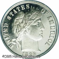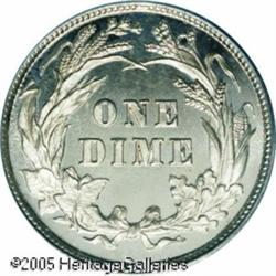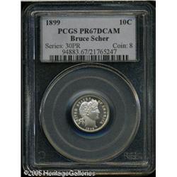 <B>1899 10C PR67 Deep Cameo PCGS.</B></I> The deeply frosted portrait exhibits prominent white on black contrast, and the wreath is also radiant despite a whisper of gold color. The major devices are fully struck, although a few dentils near 9 o'clock on each side have not received a complete blow from the dies. The O in ONE is faintly marked, the fields are essentially pristine. As of (1/05), PCGS has certified only 5 pieces as Deep Cameo, all at the PR67 level.<BR><I>From the Bruce Scher #1 All-Time PCGS Registry Set.</B></I> Lot:4059