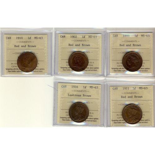 1899, 1902, 1910, 1911, 1916 1¢, all coins are ICCS MS-63 RB