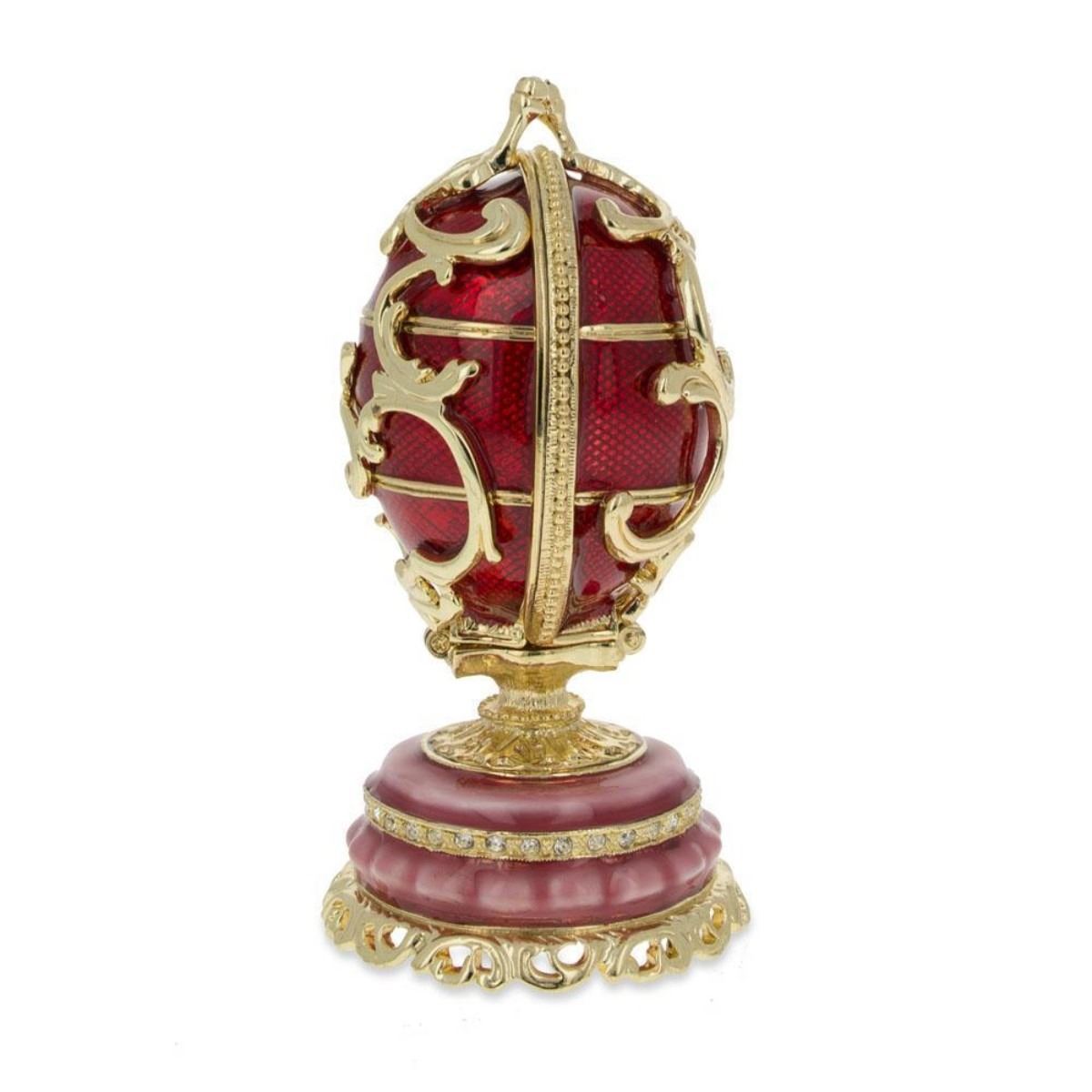 1899-1903 Spring Flowers in Red Russian Faberge Egg 3" 3.25 Inches Tall x 2 Inches Diameter 8.5 cm Tall x 5.5 cm Diameter Enamel Gold Plated Pewter, Austrian Crystals Removable Magnetic Bouquet Figurine Russian Style Gift Boxed This sparkling egg is adorned with clear crystals and high-polished pink enamel with golden trim. The egg opens in half to expose a removable and magnetically attached flower bouquet. The piece comes in a beautiful gift box. Egg History: The Original Spring Flowers Egg is made of varicolored gold, platinum, translucent strawberry red enamel, diamonds, bowenite and satin and velvet lining. The basket surprise is made of platinum, gold, translucent green enamel, diamonds and white chalcedony and demantoid (green) garnets. The Spring Flowers Egg, hallmarked with head work master Michael Perkhin's "early" mark, is struck with the St. Petersburg's assay mark for before 1899 and appears to bear a scratched number 443 (or 4) 74, which may or may not be Faberge's inventory number. Its original fitted case is stamped with Faberge's Imeprial Warant and the addresses of St Petersburg, Moscow, and London. The hallmark dates the egg to before 1899, the original case to after 1903, after the opening of the Longon Branch.