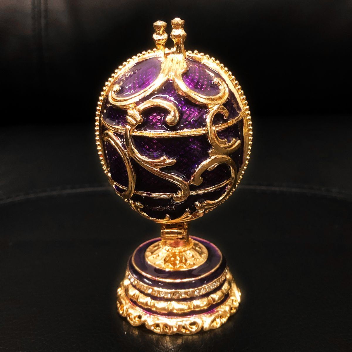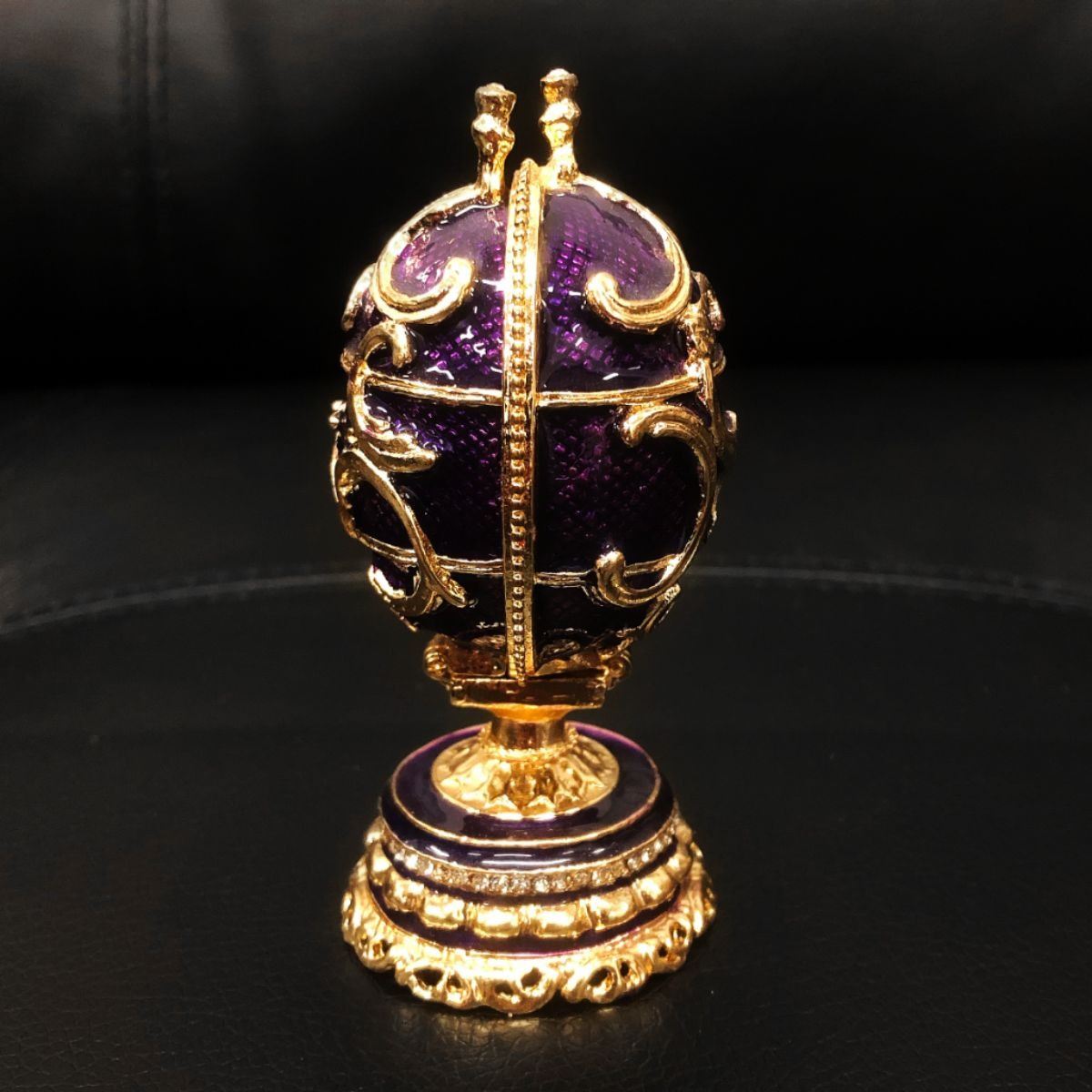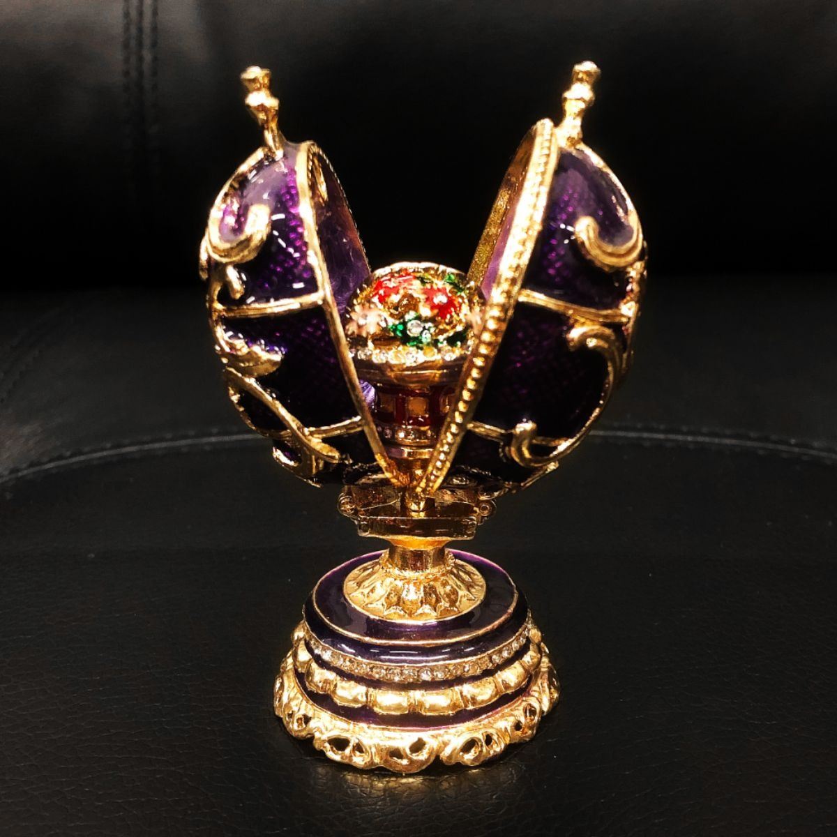 1899-1903 Spring Flowers Royal Russian Egg With Box 8.636 cm Tall x 4.470 cm Wide Enamel Gold Plated Pewter, Austrian Crystals Removable Magnetic Bouquet Figurine Russian Style Gift Boxed This sparkling egg is adorned with clear crystals and high-polished enamel with golden trim. The egg opens in half to expose a removable and magnetically attached flower bouquet. The piece comes in a beautiful gift box. View Photos For Further Details